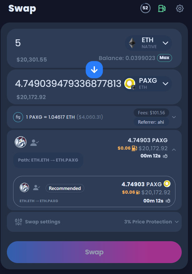 Once you have ETH in your wallet, you can use the 1inch provider (available within SwapKit’s single-chain aggregation layer) to swap ETH into PAXG directly on Ethereum.